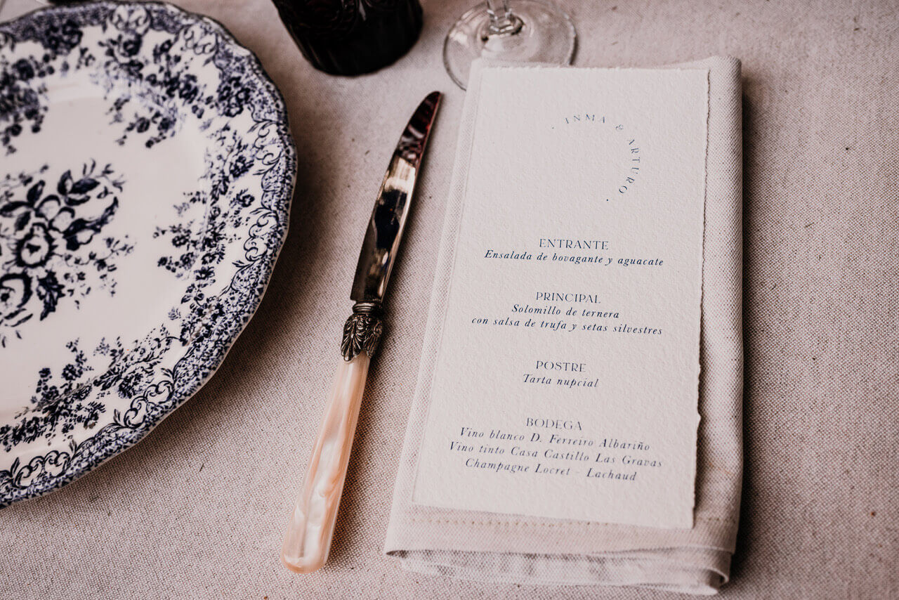 Papel con cuerpo, impresión clásica y una paleta que armoniza con mesas cálidas y delicadas.